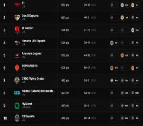 拳头官方更新全球战力排行:T1第一LCK包揽前四AL第五