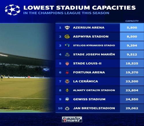 欧冠本赛季容量最小的球场排名卡拉巴赫主场5800人位居第一_法甲直播