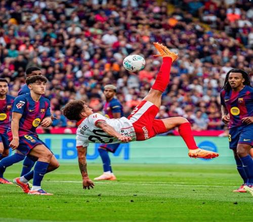 雷速体育10月19报道 本轮西甲,维特塞尔在对巴萨的比赛中打入漂亮的倒钩进球,一度将比分追平,但最终赫罗纳还是1-2输给了巴萨。