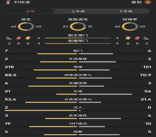 双红会半场数据对比:双方射门接近,利物浦场面略占优