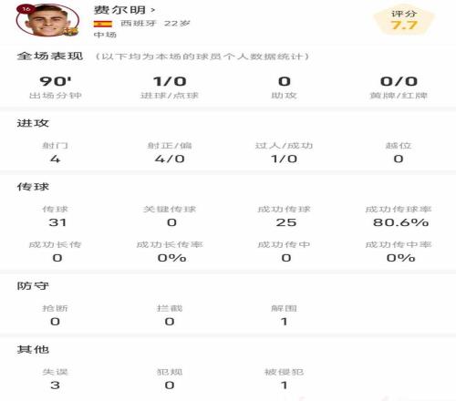 比赛中费尔明31次传球,25次到位,传球成功率80.6%。