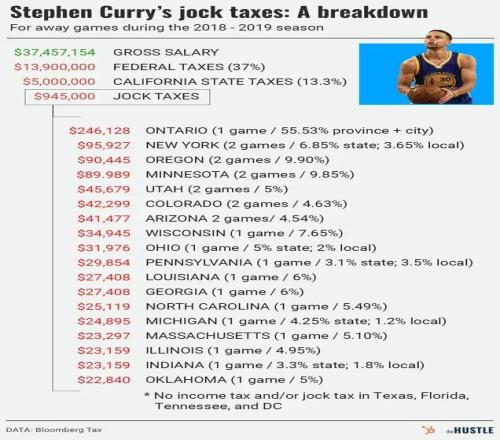 简单来说,每到一座不同的城市打客场,球员都就会被记上一笔「Jock Tax」,这意味着NBA球员在打完一个赛季后,必须要向十几个州分别申报、缴税。