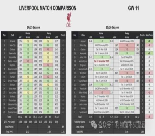 而如果把利物浦前11轮比赛结果,与上赛季同样对阵结果对比,利物浦比上赛季少6分。