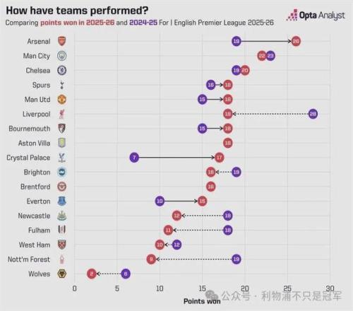 而阿森纳比上赛季同期多7分,是进步第二大的球队,第一是利物浦苦主水晶宫,比上赛季同期多拿10分。