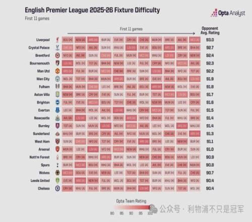 --本赛季英超已经进行的前11轮比赛,利物浦的赛程难度最大,高居英超第一。阿森纳的赛程难度只排到第15,也就是第六容易。